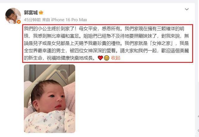 待妥善安排好宝宝之后,郭富城随后在社交平台上发文 :“我们的小公主终于到家了!母女平安,感恩所有。我们家现在拥有三颗璀璨的明珠,我感到无比幸福和富足。”